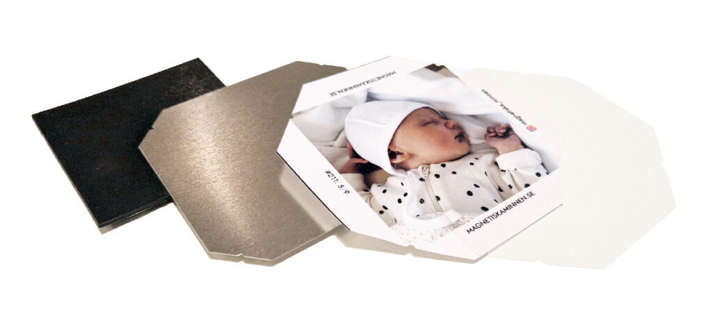 Våra magneter är tillverkade av 4 komponenter som tillsammans bildar en stabil magnet som är hållbar och lätt att flytta på. Det ger också en kvalitativ känsla i handen och ett exklusivt utseende (jämfört med print på ett magnetiskt papper). Bilderna skrivs ut på ett högkvalitativt papper på en modern skrivare och pressas tillsammans med en metallskiva, magnetiskt baksida och skyddsplast ihop till en magnet.